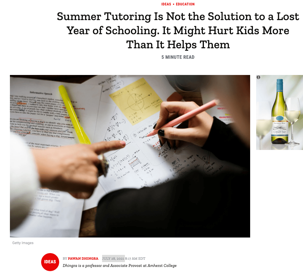 TIME MAGAZINE: “Summer Tutoring Is Not the Solution to a Lost Year of Schooling. It Might Hurt Kids More Than It Helps Them” (JULY 28, 2021 )